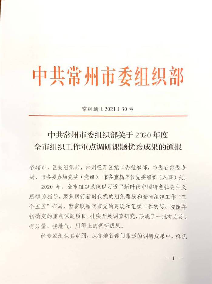 近日,中共常州市委组织部印发《关于2020年度全市组织工作重点调研课题优秀成果的通报》,公布优秀成果一等奖2篇、二等奖3篇、三等奖5篇、优秀奖15篇。