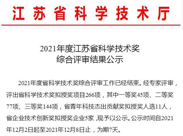 近日,江苏省科学技术厅公布2021年度江苏省科学技术奖综合评审结果。我校1个主持完成、2个参与完成的项目均获三等奖,获奖数量位居全省同类高校前列。