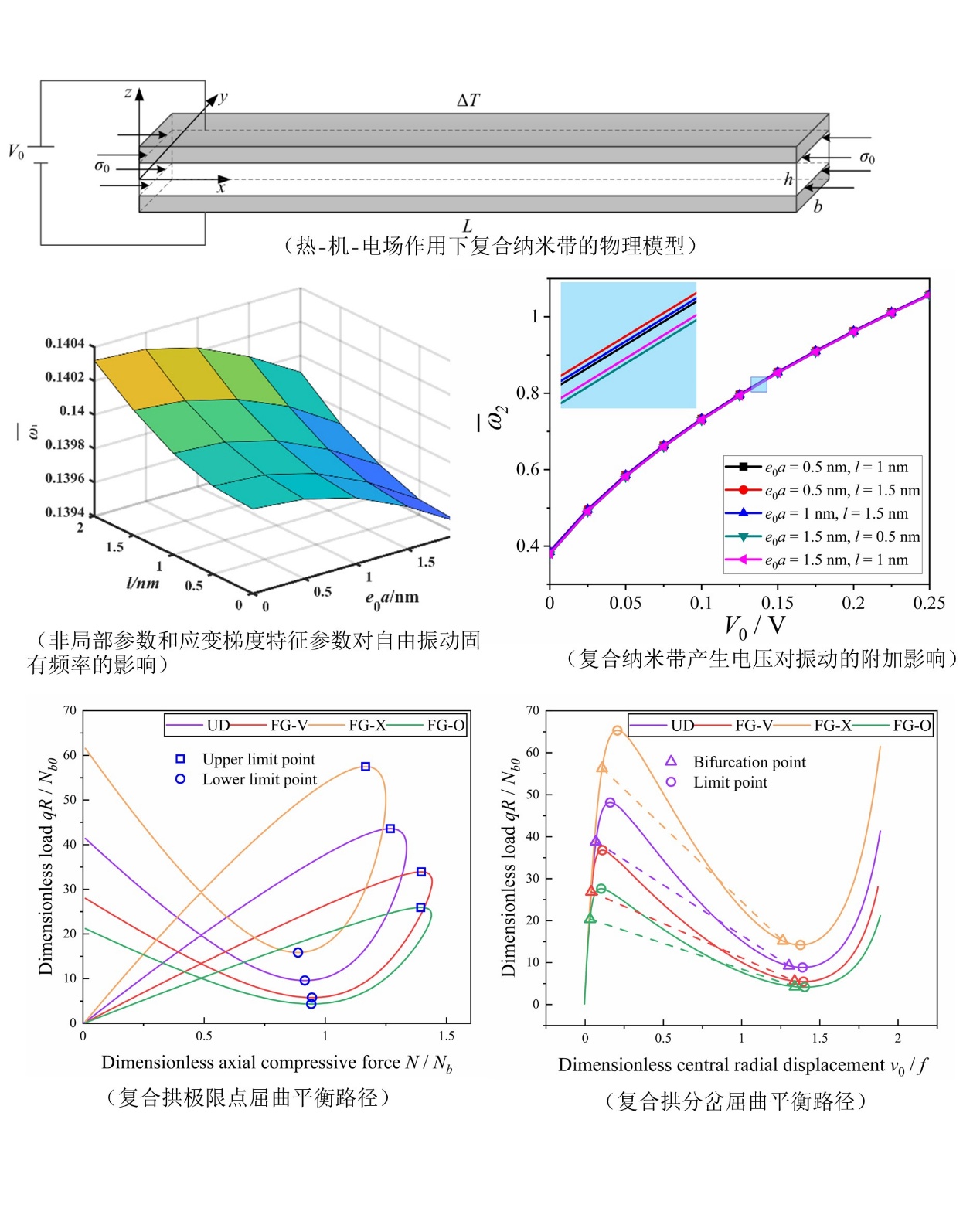 纳米增强复合材料与结构在航空航天、轨道交通、汽车工程、海洋船舶乃至生物医学等重要工程领域有着广阔的应用前景,研究其力学性能并用以指导纳米增强复合材料与结构优化设计是当前力学、机械、材料学等学科的前沿热点课题之一。日前,汽车工程学院先进材料结构与传感技术实验室李成教授团队在自供电复合纳米带以及碳纳米管增强复合拱方面取得了重要进展,相关研究成果以《Free vibration of self-powered nanoribbons subjected to thermal-mechanical-electrical fields based on a nonlocal strain gradient theory》为题发表在《Applied Mathematical Modelling》上,以《Nonlinear in-plane thermal buckling of rotationally restrained functionally graded carbon nanotube reinforced composite shallow arches under uniform radial loading》为题发表在《Applied Mathematics and Mechanics-English Edition》上。