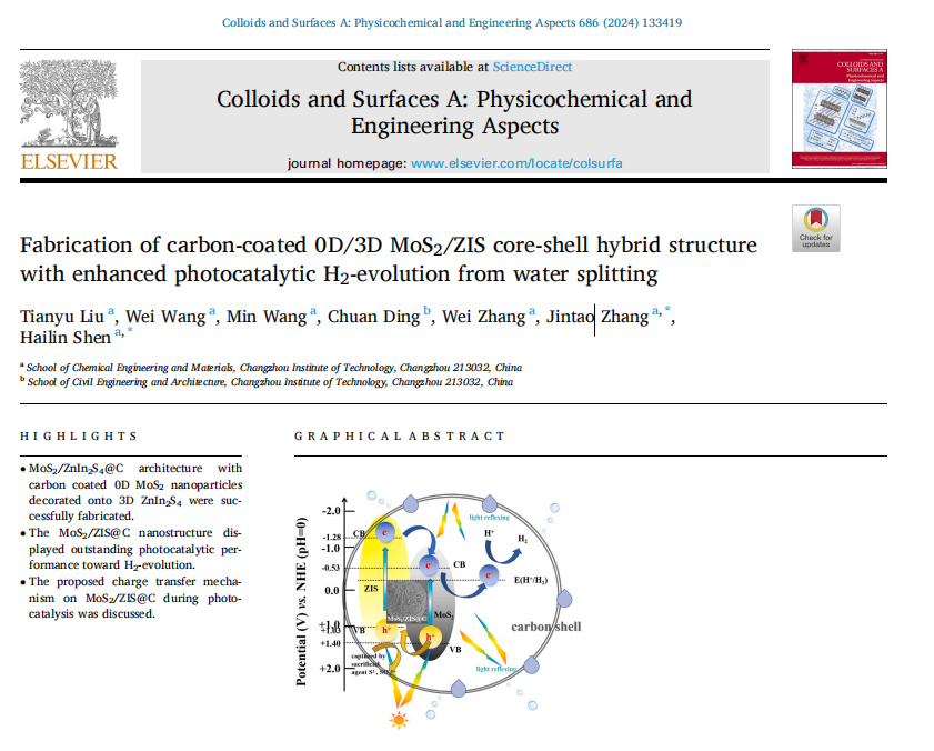 近日,我校化工与材料学院教师刘天宇及其合作者在ZnIn2S4基复合光催化体系设计剂及制氢领域取得新进展,相关成果以《Fabrication of carbon-coated 0D/3D MoS2/ZIS core-shell hybrid structure with enhanced photocatalytic H2-evolution from water splitting》为题发表在《Colloids and Surfaces A》上。该研究设计了碳包覆零维/三维MoS2/ZnIn2S4复合光催化体系,利用异质界面的有效构筑促进了光生载流子的快速分离,同时碳壳层在提升稳定性、促进光吸收及载流子传输等方面也起到积极作用,从而表现出优异的制氢性能。