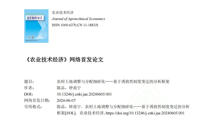 近期,我校经济与管理学院陈品博士与农业经济学领域知名专家南京农业大学钟甫宁教授合作的研究成果《农村土地调整与分配细碎化——基于诱致性制度变迁的分析框架》在农业经济学权威期刊《农业技术经济》首发。该研究围绕我国农村土地分配细碎化的现实,重新审视了土地调整对细碎化的影响,提出了在规模经济的诱导下土地调整对细碎化的不同效应。该研究成果为土地调整领域的研究作出了边际贡献,为我国农村土地延包工作的开展、为推动地块层面规模化分配与经营提供了相关政策的制定依据。